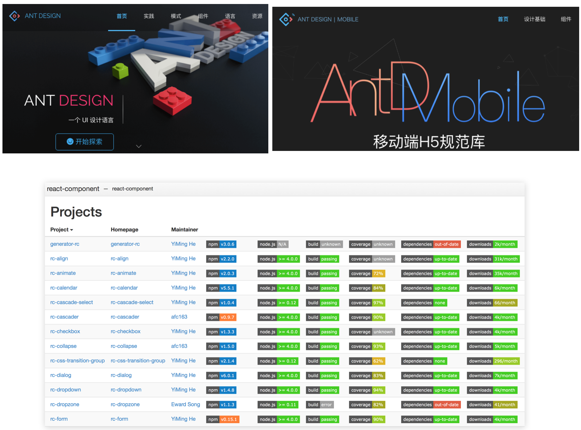 在组件方面形成了 antd/antm/react-component 的三驾马车